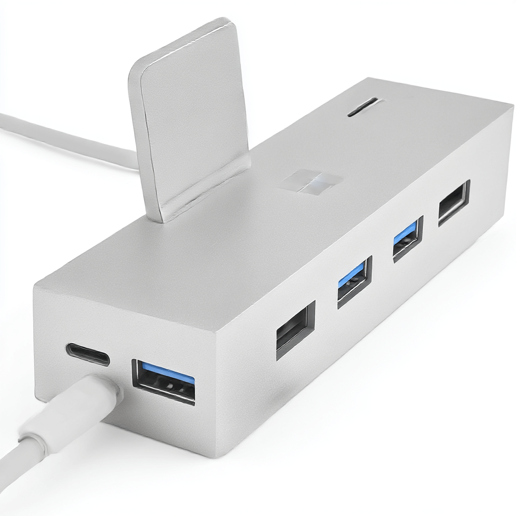 Optisch passt das Dock perfekt zum Surface-Design – silberne Aluminiumoberfläche, rutschfeste Gummifüße, dezentes Branding.